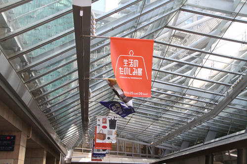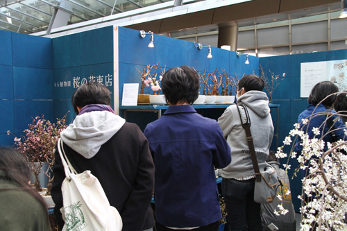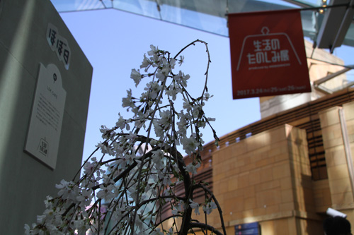 ▲「生活のたのしみ展」のフラッグと、「そら植物園 桜の花束の店」の力強い桜。