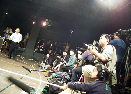 オール日本人キャスト(!!!)で この5月に大阪と東京で公演します。 これを「やるぞ!」と言い出したのが、 大きなテレビ局でもなければ、 大きなイベント会社でもない、 ましてや大劇団でもない、 はっきり言えば「東京下町の、ちいさな一演劇事務所」、 「tpt」だったのです。 無茶でしょう? 無茶だと思った。 でも不可能じゃない。 さてこの日の記者会見。 テレビカメラと記者の皆さんがずらり、 40社60名という大にぎわい。 これ、関係者の誰ひとり予想しませんでした。 まず、アルゼンチンから来た振付家グスタヴォが、 ひとりずつ出演者を紹介します。 主演の別所哲也さんと子役の男の子、 そして16人の女性たち。みんな稽古着です。 英語だけれど、名前と役名だから大丈夫。 グスタヴォは演出家より早く3月中旬に来日し、 歌とダンスの稽古をスタートさせていました。 とくに司会者の姿もないまま、外国人が日本人キャストを 紹介することからはじまる記者会見。 この始まりで、会場に優しい空気が生まれました。