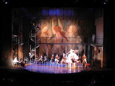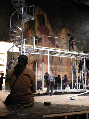 ■ ■ ■ ■ ■ ■ ■ ■ ■ ■ ■ ■ ■ ■ ■ ■ 第十回 巨大壁画の女神が出現?! ■ ■ ■ ■ ■ ■ ■ ■ ■ ■ ■ ■ ■ ■ ■ ■ 4月29日、東京での最後の稽古。 演出家は今回のリハーサル中に何度か口にしたことを、 最後の稽古場でも繰り返し、締めくくりました。 「今までぼくが知るなかで、 このカンパニーはいちばんだ!」 そして演出家はそのまま大阪へ。 キャストは30日と1日に別れての移動です。 大阪シアターBRAVA! では、 すでにセットが建ち上がっています! 美術はスコット・パスク。 衣裳・小道具はヴィッキー・モーティマー。 ヴィッキーは演出のデヴィッド・ルヴォーとともに、 tptでずっとコンビを組んできた世界的才能です。 昨年日本では、野田秀樹さんの『赤鬼』 (ロンドン・ヴァージョン)も手がけています。 『ナイン THE MUSICAL』のセットは、 一見とてもシンプルです。 でもよく見ると、現代と古代がミックスされた、 不思議な雰囲気を漂わせています。 そして、後半にはスペクタクルが‥‥ 初演時に来日したブロードウェイのスタッフは、 日本人スタッフがたった3日でセットを 建て込んだことに驚きの声を上げました。 「彼らは天才だ! ブロードウェイでは最低1週間はかかるのに!!」 しかも巨大壁画「三美神」の出来ばえには、 ブロードウェイよりすばらしい、と。 「三美神(スリー・グレイセス)」というのは、 イタリア・ルネサンスの巨匠ボッティチェリが ローマ神話を題材に描いた、 『プリマヴェーラ(春)』のなかの三人の女神です。