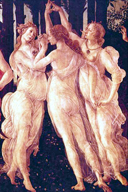 『ナイン THE MUSICAL』の後半、 この巨大壁画「三美神」(約12メートル!)が出現し、 さらに大量の水(なんと11トン!!)を使っての スペクタクル・シーンがあります。 演出家はこの大量の水について、 三美神の「哀しみの涙」であり、 映画監督グイドが女性たちから得た、 「芸術的ひらめきの洪水」とも言います。 (ここは見せ場のひとつです、 これから観てくださるかた、 このシーンしっかり観ていてくださいね、 同時にいろんなことが起きてますから!) で、なぜ、ボッティチェリなのか? それは観客席のひとりひとりの想像力に まかされることだと思います。 ですが、絵画に疎かったぼくが、 先に知っていればもっと楽しめたと思うことを おせっかいながらお話ししちゃいます。 『ナイン』の舞台はイタリア。 ローマ法王のお膝元、カトリックの国です。 「ローマ」も「カトリック」も、 とくにユダヤ人を中心とする芸術文化圏からは、 嫌悪や憎悪の対象とされてきました。 ローマ・カトリックには、 男性優位の最も保守的な宗教として、 女性の地位向上を妨げて来た歴史があります。 (『ダ・ヴィンチ・コード』がそういう話でした!) カトリックの社会に生きたボッティチェリが、 ローマ神話の世界を題材に選んだのは、 厳格な宗教規範と正面衝突することを避けつつ、 女性美を思い切り描く手段だったからでしょう。 そして『プリマヴェーラ』のなかに、 春の訪れと喜び、愛と人生を、 芸術的寓意を込めて表現したのです。 ボッティチェリの「三美神」は、 女性美の象徴であるとともに、 映画監督グイド・コンティーニの 芸術を創り出す魂の象徴として、 『ナイン』の舞台美術に選ばれたのだと思います。