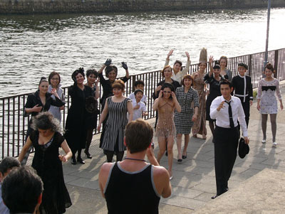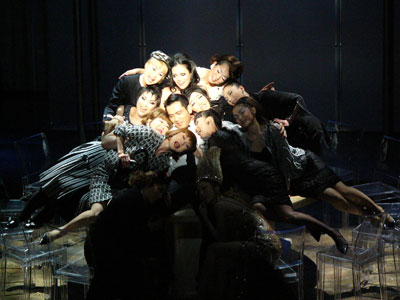 ■ ■ ■ ■ ■ ■ ■ ■ ■ ■ ■ ■ ■ ■ ■ ■ 第十五回 あらためて大阪公演開幕レポート! ■ ■ ■ ■ ■ ■ ■ ■ ■ ■ ■ ■ ■ ■ ■ ■ それではぼくからも、 この3日間ぐぐぐっとおさえてきた 大阪公演開幕の興奮をお伝えします。 『ナイン THE MUSICAL』の上演記録に、 そしてシアターBRAVA!の歴史に刻まれた、 あの日のカーテンコールの数分間のこと。 ●いちばん最初の「ブラヴァ!」 初日のカーテンコール、 気がつけばスタンディングオベーションのなか、 シェフさん、べっかむさんと並んで拍手を送ってました。 素晴しく仕上がった舞台に、それから観客席に。 ありがとう! ありがとうございます! 満員だ! そこから見えなかった2階席からも満席以上の拍手! ついに聞こえたブラヴォ! そして、ブラヴァ! さすがわかってらっしゃる、大阪のお客さま。 そう来なくっちゃ。 劇場に名前がついたときから、 関係者の誰もが思い描いてきたこの瞬間、 シアターBRAVA!に響く最初の「ブラヴァ!!」 素直な感動のコールでした。 「ブラヴァ!」は舞台上の女性を讃える感嘆詞。 しかも『ナイン THE MUSICAL』は、 シアターBRAVA!の「こけら落とし」。 先日「あっち」さんがメールで教えてくださったとおり、 みんなに福がある、みんなが祝福される公演です。 さらに、なんと言っても『ナイン』は、 「女性たちを、愛するということを、 そして夫婦の愛を祝福している作品」ときてます。 もう「こけら落とし」の開幕初日となれば、 盆と正月とコングラッチュレーションと セレブレーションが塊で来たみたいな日です。 加えて、広報係がいうのもアレですが、 舞台の仕上がりも最高でした。 ありがとう! おめでとう! うれしい! すばらしい! 別所さん、なんていい顔なんだろう。 新キャストのみんなの瞳も光ってる。 スタンディングオベーションの嵐のなか、 シアターBRAVA!にありとあらゆるハッピーが 宿ったのでした。 ●なにわの空の下、熱いぞ! 公開衣裳パレード すでに舞台稽古が一段落していた初日前日の午後、 気温27度、初夏を思わせる快晴の劇場前に、 こんな大盛り上がりがありました── 最終リハーサルまでの数時間を見計らっていた 門井プロデューサーが仕掛けたプログラム、 キャスト全員のコスチューム写真の撮影。屋外で。 祝日の昼すぎ、大阪城公園に面した玄関前は、 いつもより人通りも多くにぎやかでした。 そこへ衣裳をつけメイクをした俳優たちとカメラマン。 道行く人が少しずつ気づき始めます。 撮影ポーズが決まるとキャスト同士の歓声、 その盛り上がりにみるみる人垣が。 あ、リトルグイド役の向笠くんがチラシを配ってる! 「あしたから始まる『ナイン』です! ミュージカルです、観てくださいっ。」 劇場主任もすかさず事務所へチラシをとりに走る。 打ち合わせなし、楽しいパプニングの連鎖。 劇場玄関前に巻き起こった突然のフェスティバルです。 ![]() ![]() スケジュール表にも書いてなかった「衣裳パレード」。 TVコマーシャルやポスター貼りは、 シアターBRAVA!ががんばってくれました。 でもtptじゃなきゃできないことを、 劇場前で起してみせた門井プロデューサー。 ここで演劇がはじまるんです! そう伝えた出来事です。 演劇をつくることの一部として。 演劇をつくるハートで。 ●創造の記憶を刻め!直前ワークショップ 門井さんの企てはもうひとつありました。 最終リハーサル2時間前、劇場ロビーでの、 「ミュージカル・ワークショップ」の開催。 ミュージカル学校の生徒さんや、近県の劇団から、 急遽約20名に参加していただいて。 おそらく、連絡したのは前日のはず。 そしてはりきったのは振付家のグスタヴォ。 稽古で毎日やっているリラックス・マッサージ、 ウォーキング、それから『ナイン』のナンバー、 「フォーリー・ベルジェール」の振付。 途中からキャストの池田さん、宮さんが合流。 ワークショップは90分間。 リハーサル開始30分前までやりました。 ![]() これもスケジュール表にはなかったイベントです。 劇場関係者はリハーサルにお招きした人を迎えつつ、 ロビーを注目してました。 舞台の進行に余裕がなければできなかったことですが、 門井さんがどうしてこれを必要としたか── ぼくは企てを聞いていたのに手伝えなかったし、 眺めつつ感動してたことも告白してませんが、 こんなふうに想像しています。 シアターBRAVA!は真新しい劇場です。 tptが「こけら落とし」に選んでもらって、 劇場をただの入れ物にとどめたんじゃつまらない、 創造のエネルギーを生み出す場所として出発させたい、 そういう思いじゃないかと。 儀式や乾杯も本当に大切だけど、 開幕前にどうしても欲しかったのは、 劇場に生きた記憶を刻みこむことだって。 公演が始まってからじゃなく、このときに。 開幕直前に新劇場のロビーで起きたことは、 ワークショップに参加してくれた人たちを通して、 ずっと宣伝されることを心密かに願います。 きょうのことは全部、 