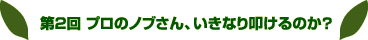 "タルコンガ"をおそるおそる叩き始めるノブさん。