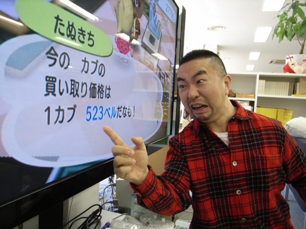 朝会社にきたら、 なにやらを話している。 なになになになに? 523ベルなの!」 えー、なんの話かといえば、 「どうぶつの森」の話です。 どうぶつの森には、 「カブ」というものが売られていて、 その値段は日によって違うのです。 安値でかって高値でうれば、 森のなかで大金持ちです。 さっそく 確認をします。 こ、これは! これは!」 どうやら、 自宅に帰って、 カブを売ってくるようです。 |