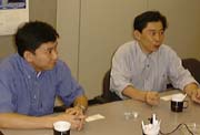 | ここは東京新都心・新宿。 広い道路を目の前にした大きなビルのワンフロアに、 マリオゴルフ64をつくったゲーム制作会社 「キャメロット」があります。 もうじき発売されるゲームボーイカラー用のソフト 「マリオゴルフGB」が制作追い込みで、 しっちゃかめっちゃかになっているであろうことは わかっちゃいるのに、ちっともかえりみない、 ずうずうしい「ほぼ日」編集部突撃取材班は、 「こんにちわ〜!」 と元気に(ノーテンキに)ドアを開けました。 「いらっしゃい! こんにちわっ!!」 うわ! ものすごく元気なお出迎えの声が。 それが、タカハシ・ブラザーズこと、 高橋宏之さん、高橋秀五さんご兄弟でした。 ちょっと面長で落ちついた雰囲気が、お兄さんの宏之さん。 秀五: ──え? ちょっと、しますけど。 秀五: ──うわぁ。トレーニングが日課!? 宏之: 秀五: ──腕前はどれくらいなんですか? |