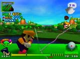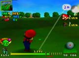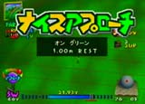 | ティーショットを打つ前に、 元気くんはホール全景画面を見て、方向を微調整。 みごとフェアウエイの真ん中に落としました。 フェードするワリオのクセを完全に把握しています。 智充くんは、迷いなく豪快にショット。 続いてのイチローさんは、2打目にして 「よしっ!」 ガッツポーズの横山チーム。 クラブが、芝をたたく鈍い音がしました。 無念。またもや、打点が早すぎです。 |