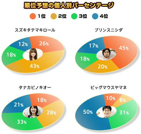 | では、読者のみなさまからいただいた順位予想を 各個人の順位別にパーセンテージを出してみましたので ここらでご紹介いたします。 |
