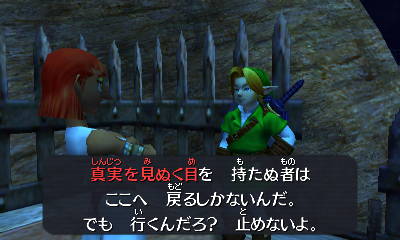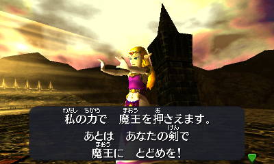 ゲームをクリアーするということの楽しさを知る。 目の前に立ちはだかる障壁が現れたとき、 プレイヤーはどうするか? キチンと考えて実行に移し、 トライ&エラーの精神で正面から向き合う。 そして、その障壁を乗り越えたときに喜びを感じる。 それこそが真のゲームプレイヤーである。  本校は、『ゼルダの伝説 時のオカリナ 3D』を通じて、 プレイヤーに「ゲームを解く」ことの喜びを 少しでもいいから知ってもらいたい、と考えております。  そしてその喜びを連続して感じていくことで、 エンディングまで迎えてもらえれば、 そんなにうれしいことはありません。
