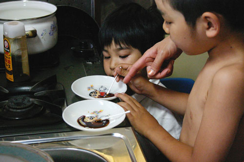 秘密実験 なにやら台所でヒミツの実験をしている、 ハダカレンジャー1号2号。 古い10円玉をぴかぴかにするのに、 醤油とソースでは どっちがスゲエか?? パワー比べだぜ! 2004年・葉山にて。