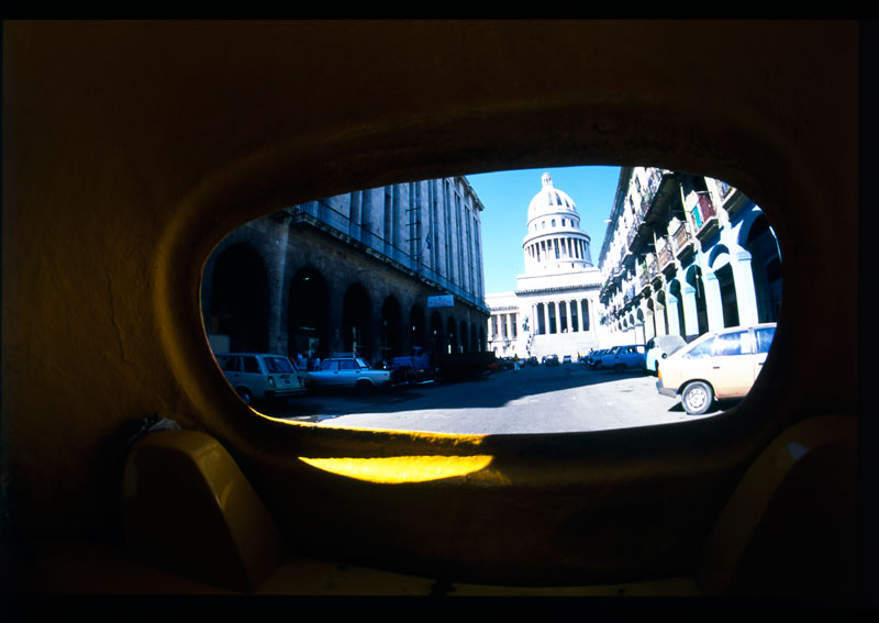 キューバの首都ハバナで、人力タクシーの後窓から