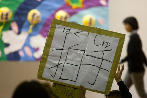 その合間に、黒子のような子が「拍手」というプラカードを掲げると