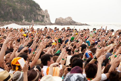 ビーチステージでの熱いライブを終え 一服中の、Theatre Brook・佐藤タイジ。