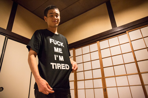 久しぶりに会った友人の息子、 何を隠そう元・お尻レンジャーである彼は 春からファッション関係の学校に通い始めて、 すっかり大人! 毎日、通学と課題に追われる日々だという。 帰ってきたところを「元気か?」と聞くと Tシャツの文字を差し出した。 生意気なところは変わらず、ひと安心。