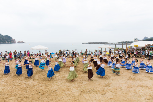 雨上がりのビーチでフェスのオープニングを飾った、 ウェルカム・フラ。 総勢50名の女性ダンサーたちは、 三世代にわたる幅広い年齢層で そのローカル感、シンクロする舞、 入場間もない観衆らを しばし釘づけにするほどの、 見応えあるエキシビションだった。