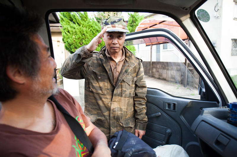 畑仕事の相棒ツヨシと移動中、突如現れた 近所のユニークなおじさん。 迷彩服で一瞬ギョッとしたけど 「戦争反対!!」、 パトロールおつかれさまです! @Itoshima・Fukuoka 2017