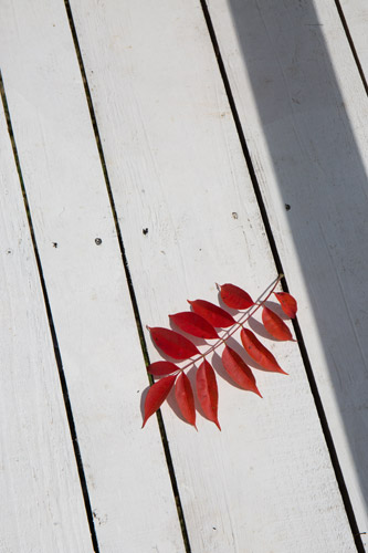 夏の名残りが残る光の中、赤い落ち葉が