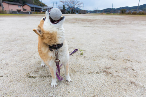 隣犬のシバと、グランドゴルフ場でキャッチボール。