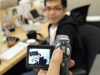 ぼくもやってみたのですが、 シャッターボタンが 右上にあるカメラがほとんどなので 逆さにして左手でもつと、持ちづらいうえに、 液晶画面が手でふさがっちゃったりして とても見づらかったです。 じゃあ携帯電話はどうかなと思って 試してみたんですけれど、 電話をかけるのは左右どちらの手でも できるんですが、カメラ機能になると、 やはり右手で使うように設計されていると 思いました。 なかなか、むずかしいところですねー。 やはり縦型がよいのかな。 そうそう、「Xacti」、 ためしてみましたよ。 左手で持つと、こう。 |