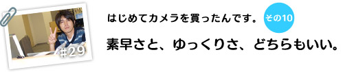 そこをどうしたらいいのかは ぼくにもよくわからないところなんですが、 無理して撮ることで、 カメラや、写真がきらいにならないでね。 「撮りたいな」っていう気持ちのときに そばにカメラがあってよかった、 ということを重ねていくと、 そのうち、人も、半歩前にすすんで 撮れるようになるかもしれないよ。 それに、その瞬間をはやくおさめたいと 思うときもあれば、 ゆっくり撮る、その前後の時間も含めて 写真って、写るものだったりするから、 どちらがいいとも言えないと思うんです。 ‥‥ごめんね、明解な答えがなくて。 |