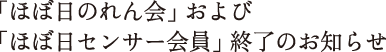 | ◆ほぼ日のれん会とは? ◆のれん会加盟店リストはこちらへ ![]() 「ほぼ日読者同士で親切にしあいましょう」を コンセプトに、 2000年にはじまった「ほぼ日のれん会」と 「ほぼ日センサー会員」の制度につきまして、 2009年3月末日をもちまして 正式に終了することになりました。 ほぼ日刊イトイ新聞の創刊から2年目、 登録いただいた個人情報につきましては、 これからも「ほぼ日刊イトイ新聞」を ![]() 2000年から2001年の間に募集を行い、 数多くの方にご登録いただいた「ほぼ日センサー会員」。 2005年の個人情報保護法に伴うアナウンス以降、 しばらく休止状態となっておりましたが この度、2009年3月末日をもって 正式に終了することにいたしました。 それに伴い、「ほぼ日センサー会員」と 「ほぼ日クレジットカード」の特典である 「ほぼ日のれん会」でのサービスも 終了させていただくことになりました。 ほぼ日編集部の中でも なお、登録いただいた個人情報につきましては、 これからも「ほぼ日刊イトイ新聞」を 株式会社東京糸井重里事務所 担当:西本武司 中林華恵 渋谷侑美江 なお、今回の件についてのお問い合わせ、御意見などは |