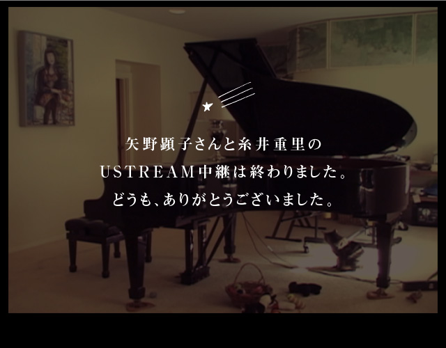 矢野顕子さんと糸井重里の USTREAM中継は終了いたしました。 ご視聴、どうもありがとうございました! |