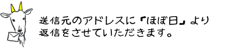 「ほぼ日」がお休み中ですので、 返事が届かない場合、 ○お使いのプロバイダーになんらかの障害があるときに、 ○「自動送信」のメールを ※みなさまのメールソフトや、ご契約プロバイダーの ○ご自分のメールソフトの「送信元」のアドレスの |