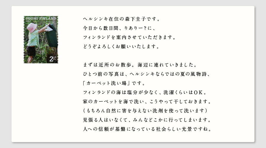 さいしょの訪問地、生まれ故郷のフィンランドに、りありー?が無事到着しました。森下圭子さんのお宅で、お世話になります。