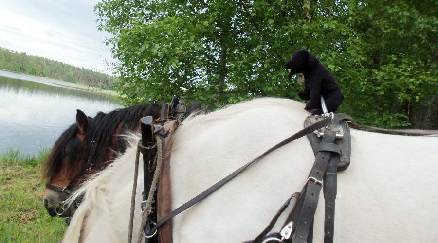 はじめて馬に乗るのか、おっかなびっくりの、りありー?。