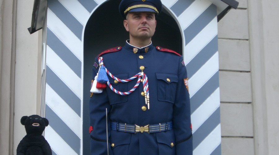プラハ城の衛兵さんの横で、りありー?も気をつけ!
