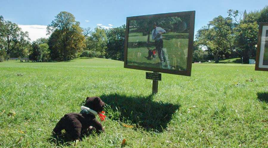 オバマとファーストドッグであるボーくんの写真パネル。