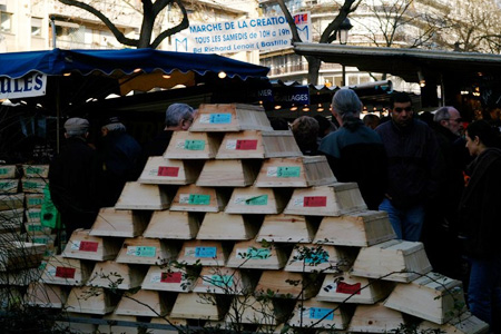 | 岡尾 | (笑)‥‥あとなんだろう。 これは、家具ではないんですけど。 初めてかな、2回目だったかな? フランスにいったときに、 生牡蠣を入れる、 木で作られたかんたんな箱みたいなのを 魚屋さんで見て、どうしても欲しくなったんです。 持って帰りたいなと思って、 お願いして、頂戴したんです。 ところが、これは、ものすごく匂いがすることがわかって、 結局、ホテルでさようならしました。 これも、あきらめた思い出のひとつ(笑)。 |