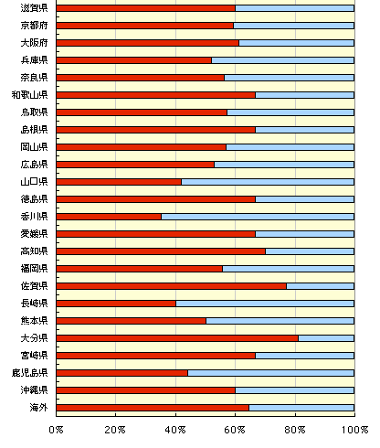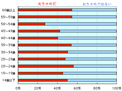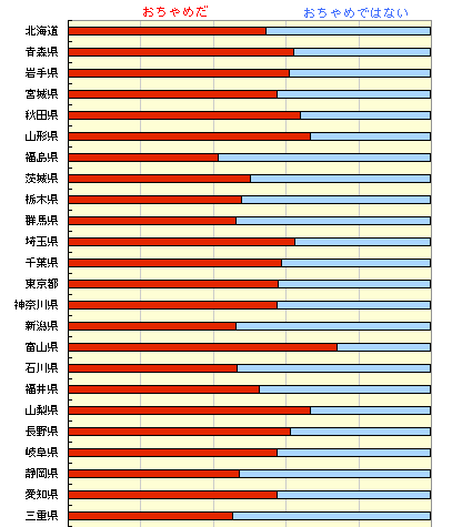 男女別で年齢別に集計すると 少しですが違いが出ました。 男性は低め安定ながら、 40代〜50代前半の「非おちゃめ」が 目立ちます。 それでも、50代後半から むしろ増量気味にもとに戻ります。 もしかして、人は一生を通じて、 「『おちゃめ』は『おちゃめ』、 『おちゃめではない』は 『おちゃめではない』 」 ということなのでしょうか。 しかしまったく逆なことに、メールでは複数、 「年配の方のほうがおちゃめ」 「歳をとるにつれておちゃめは辞めた」 というふたつの反対の意見がありました。 もしかして、どこかで入れ替わる ポイントがあるために、 全体の数が変わらないのかもしれません。 どなたか「おちゃめ」を 研究してくださいませんでしょうか。 ひょっとして、人類の未来に役立つかもしれません。 「まずはおちゃめとおちゃめではないの 分離に成功しました! 名付けて『脱離おちゃめ化法』 (田中耕一さんにあやかってみました)。 浮いてくるのが、『おちゃめ』です」 なんてね。 ノーベル賞、決定。 ごほん。 次に、いくつか、「住んでいるところで違うはずだ!」 「大阪ではおちゃめやったけど、東京はあかん!」 などのメールがありましたので、 住んでいるところ別の集計をご覧ください。