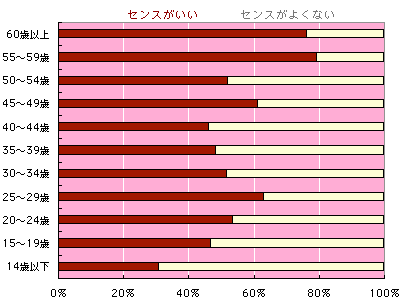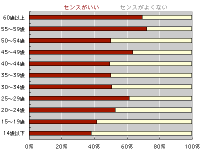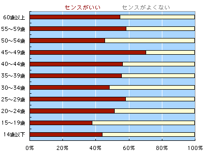 全体も、男女別も、 大きくは同じ流れです。 ●25〜29歳に一度ピークがあり、 ●45〜49歳で次のピークが来て、 ●その後しばらく落ち着くものの、 また上がってそのあとはずっといい!! です。 数字だけの結果から、理由を決めつけることは 避けたいところですが、 こんなストーリーが思い浮かびました。 ひとつの考えとしてお読みください。 ●25〜29歳に一度ピークがあり、 ↓ 社会人として落ち着き、自分のお給料で 好きなものが買えるようになってきたので、 センスの花が開く。 ●45〜49歳で次のピークが来て、 ↓ 結婚生活や子育てが一段落。 自分のしたいことができるようになって、 自分のセンスを取り戻す。 ●その後しばらく落ち着くものの、 また上がってそのあとはずっといい!! ↓ リタイア後の人生、好きな服を着たり、 好きな音楽を聞いたり。センスを極める。 いかがでしょうか。 「わたしはこう思う!」などのご意見がありましたら、 ぜひ教えてくださいね。 今度は住んでいるところ別の集計をご覧ください。