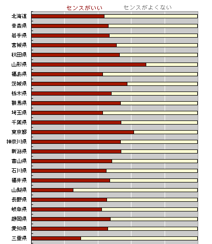 高知県がトップで、 もっともセンスがいい(70.0%)県でした! もっともセンスがよくないのは‥‥ 山梨県です!! 山梨県、常に極端ですね。 ・非常に背が高く ・一番運がよく ・かなりもてもてで ・とっても親切! しかしながら ・一番グルメじゃなくて ・センスがどこよりもよくない ‥‥山梨県、ファイト! 結果の予想を見てみました。 うーん。外れてました。 みなさんが思うよりもずっと、 「日本人は、センスがいいと思っている」 ということになりました。