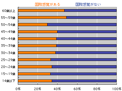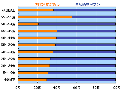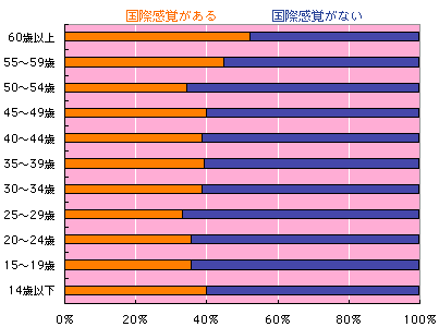 海外在住の方は、さすが、 「80%が国際感覚あり!」 でした。ほっとしましたね。 残り20%の方々、日本人的には普通みたいですよ! 以下は性別、年齢別の統計です。 男性よりも女性が、若年層よりも高年層が いくぶん高くなっています。