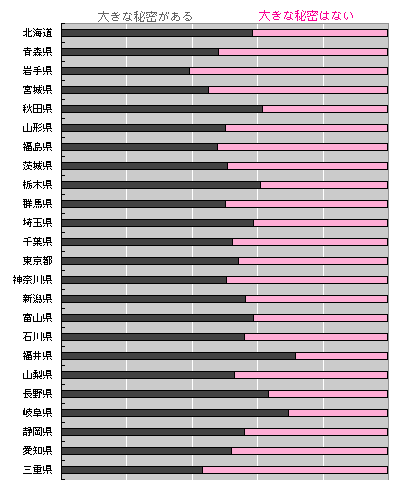 宮崎県の方は、大きな秘密を持っている人が もっとも少なく、 逆に、一番多いのは、 お隣りの大分県!! でした。 結果の予想です。 全体では、実際の結果とほとんど近いのですが、 内容を見ると、 「大きな秘密のある人は、 他の人にもあると思っていて、 大きな秘密のない人は、 他の人にもないと思っている」 単純で、奥深い結果ですね。 でもちょっと、 このことこそ秘密にしておきたかった と思うのは、わたしだけでしょうか‥‥。