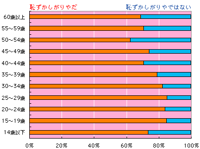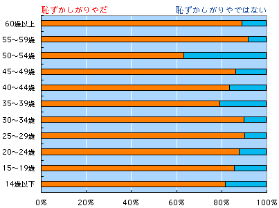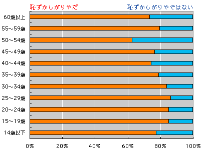 女性の方が男性よりも、 恥ずかしくありません!! あっ。お父さん達が肩を組んで 涙を流しながらうなずいています。 男子高校生が夕日に向って駆け出しました。 女性のみなさん、ばれてますよ! 乙女の恥じらいも、今日これまでかもしれません。 でもまあ、生まれながらにしてそうとは限りません。 年齢別に見てみましょう。