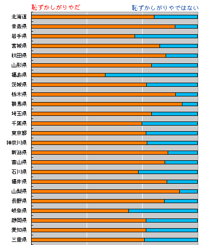 恥ずかしがりやさんは、 群馬、山梨、徳島、高知県。 高知県は、前回では「野心たっぷり」でしたし、 これまでの結果からもそうとうに 「日本人らしい」ぜよ。 山梨県は親切でなおかつもてもてでありながら 恥ずかしがりや、と。 そうなんですか? 山梨県のみなさん。 恥ずかしがりやさんじゃないのは、 福島県、佐賀県、宮崎県。 宮崎県は大きな秘密もなく、野心もそこそこ。 さらに恥ずかしがりやでもない、と。 そういえば、こんなメールもいただいていましたっけ。