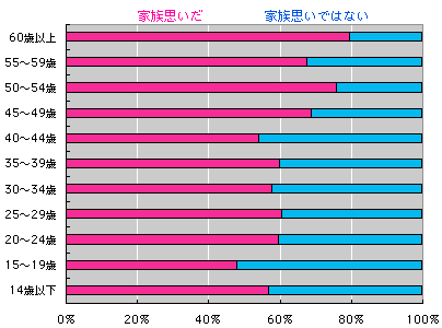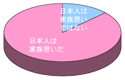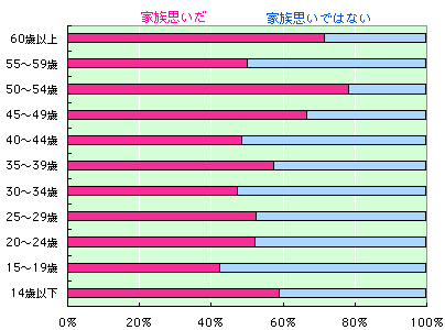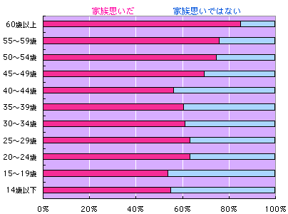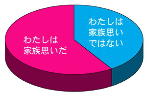 9割近くが、「日本人は家族思いだ」に投票しています。 この結果予想を見ると、 「ほとんどの人が 家族思いのはずだ」 という、神話のようなものが みんなの中にあったことがわかります。 しかしながら、結果は、最初にお伝えしたとおり 「けっこう」、つまりは、 「家族思いではない ということはない」 といった程度の、家族思い率でした。 みなさんの、正直で真摯なお答えと メールに感謝いたします。 さて、いつものように、 男女別、男女年齢別、住んでいるところ別など、 それぞれのグラフをご覧ください。 最後に、メールを紹介します。