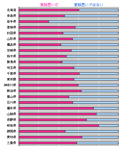またまた宮崎県が目立っていますね。 それぞれ、ご自分のお住まいのところを ご覧になってくださいね。 最後に、何よりも今回の結果を物語る、 たくさんのメールを紹介いたします。 家族の大切なエピソードや、 思いをお送りくださったのに、 全部を紹介できなくて、ごめんなさい。 すべてをまとめて表す言葉はありません。 誰かが評するものでもないと思います。 どうぞ、それぞれのメールをお読みください。 ●「家族思いだ」 両親は高齢です。 私のほうが重い病気を抱えていますが、 親より若い(当たり前)ので、 ついつい世話を焼きお小遣いをあげてしまいます。 ほんの少しでもものすごく嬉しそうな表情をするので、 なんかもうカワイイ。 兄がいますが、甲斐性ナシのロクデナシで お嫁さんにも逃げられる始末で当てにならず、 ほぼ私が大黒柱になっています。 家族思いの私には、家族がちょっぴり重くもあります。 (男脳度75%の女・石川県・44歳) 私が辛いときいつも しっかり深く支えてくるのはやっぱり両親です。 本当に無条件に支えてくれて、感謝しています。 今から結婚式の最後の両親への言葉を考えるだけでも 泣けてきます。 相手もまだいないんですけどね。。。(笑) (クロバ・島根県・21歳) 家族思いに投票しました。 4年前に母親が亡くなるまでも、 普通の家庭と比べてもかなり仲が良かったと思います。 でも、母親が亡くなって、家族っていうのは こんなにもろいものかとしみじみと思いました。 今は兄弟3人とも独立して家庭を持って、 父が実家に1人で住んでいます。 家族5人で住むために建てた家に 1人で住んでいる父のことを思うと、 とても申し訳ない気持ちになります。 でも、父はいつも○○(私)が幸せに生きてるのが 一番嬉しいことなんだよ、と言ってくれます。 最近はIP電話を導入して、電話代が無料なので 出来るだけ毎日電話したり、 おもしろい所に行ったら、デジカメで撮った写真を 送ったりして、少しでも距離を縮めようと思っています。 多分うちは相当ウェットな家庭だと思います。 (gyabu・東京都) 私は「あなたのパーソナリティとは何?」と 問われたら、「家族思い、という事です!」と 即回答する予定があるくらいの、家族思いキャラです。 先日も、実家の地域文化祭で、母が 「詩吟を吟ずるから、その司会をお願いね」と言われ、 当日渡された文章を姉と添削を重ねて、 何度も練習して本番に挑むくらいのパワーを 注いできたばかりです。帰宅した夫には、 「そんな事に心血注ぐな‥‥ もっとやる事あるだろ‥‥家事とか‥‥」 とのコメントを頂きました。 だって実家家族には、 今まで色々迂回して生きてしまった義理があってよー 今年新家族になった君にはまだそれがないからさー‥‥ と胡座をかきつつ、呟いてみました。。。 (会社員・東京都・27歳) 自分の命より大切なものはありません。 今自分に何かあったら、それは最悪にして 最大の親不孝になってしまうからです。 母は気が狂い、叔母は泡を吹いて、 父はむせび泣くでしょう。 そんな場面を想像するだけで身を切られる思いです。 ひとりっこの娘を外に出してくれた両親の勇気 (というか諦め?)にとても感謝しているので、 裏切って悲しませるようなことだけは、 と肝に銘じているつもり‥‥です。 家族を大切にする人たちは、 世界中どこでもたくさん見られますよね。 そしてその思いを、無慈悲に暴力的に奪う争いは まだ続いていて。 近頃の地球はほんとうに悲しい星です。 自分に何ができるんだろうってすごく考えます。 (カナダ・女性・20歳) 私はどっちだろうなぁなんて考えつつ 家族、家族‥‥と頭の中で繰り返していたら、 私にとっての家族は 両親や姉妹とで構成する「家族」ではなく、 すぐ横でイビキをかいて昼寝している このひと(主人)とふたりで 新しい「家族」になっていたんだと 今さらですがふと気づきました。 宿直夜勤、お疲れさま。 もっともっと大事にしてあげたいな という気持ちもこめて「家族思いだ」に投票しました。 (主婦・宮城県・34歳) 私は家族思いだと思います。 例えば、仕事帰りに友達に晩ご飯を食べに誘われても (あ、今日お母さんが家に1人だ。 寂しがるし、早く帰ろう)という思いで断ります。 夕飯がカニ鍋の時は、カニあんまり好きじゃないと言って 野菜しか食べなかったり(皆カニ好きだからね)します。 昔の話ですが、クリスマスプレゼントを買ってくれると 親が言っても、欲しい物があるのに「別に欲しい物ない」と 言ってました(お金の心配してるんです。 特別貧しかったわけではありません‥‥)。 でもこれって、家族思いっていうか ただ変に気を使いすぎ?? (兵庫県・女性・20代半ば) 私は家族思いに一票入れましたが、 家族思いである自分があまり好きではありません。 年取った親には頼られて、子供たちにはうざがられ 自分思いになりたいと思いながら、 家族のためにと行動してしまっている。 自分と家族を両立させられればい