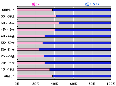 おおーはっきりと 「軽くない」が多くなっています。 「日本人の思いのものさし」でいうと、 「日本人は、ほぼ軽くない」 ということになりました。 どんどん集計を見てみましょう。