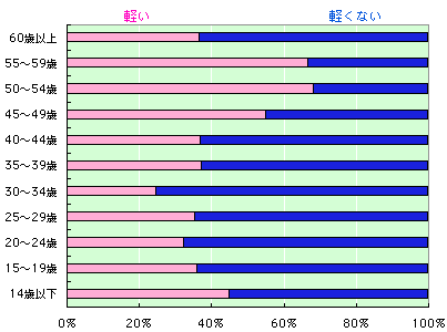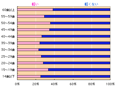 男性のほうが軽い。 そして、どちらも、いちばん軽くない年代は 30〜34歳! ここ、注目です! 驚きました。 なぜならば、こちらをご覧ください。 「ほぼ日」の人気コンテンツ、山田ズーニーさんの 「おとなの小論文教室。」、今週の水曜(11月23日)で、 「33歳病」について語られています。 なぜ、33歳前後で悩むのか? 私は、「33歳病」は、 自分が突き抜けていく前の「胎動」ではないかと思っている。 33歳と言えば、社会に出て10年過ぎたあたりだ。 同じことを10年続けていれば自分の中に何かが育つ。 これが、マグマのように内から突き上げてくる。 でも、これをうまく形にして外に伝えられない。 だから、ものすごく苦しい。 (「おとなの小論文教室。」2004年11月23日より) ここに、30〜34歳ころのみなさんが 「軽くいられない」答えのひとつ があるではないでしょうか。 この連載と今回の投票の結果が 奇しくも重なったのは、 とても興味深いことでした! では集計を続けます。