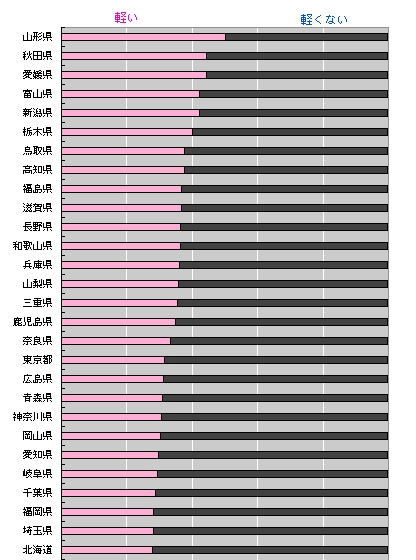 一番軽いのは山形県!! ‥‥なぜ?? まぁ、なんらかの「重さ」に疲れたら、 山形に旅行するのもいいかもしれません。 山寺がありますよー。 岩にしみ入る蝉の声ですよー。 NHKドラマ「おしん」の舞台ですよー。 ‥‥お、重い‥‥。 結果の予想はいかがでしたでしょうか。