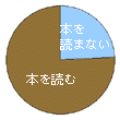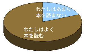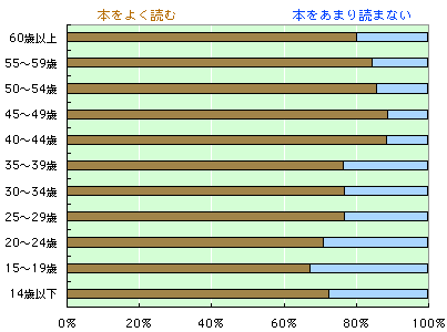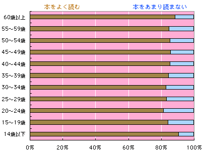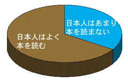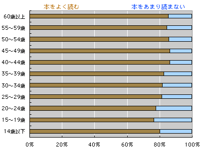 という結果でした。 実に、80パーセント強。 SMAPならば、1人だけ、あまり本を読みません。 さあ誰でしょう!! ‥‥答えなくて結構です! そっと胸に秘めておいてください。 恒例、「日本人の思いのものさし」でいうと、 「日本人は、それはもう、 本をよく読む!」 ということになりました。 さて、この結果、いかがですか? メールでは10人に1人くらい、 「『ほぼ日』の愛読者なら本もよく読むであろう」 と予想してくださっていました。 では、ちょっと比べてみましょう。 こちらは、平成14年度の文化庁調査資料です。 http://www.bunka.go.jp/1kokugo/14_yoron.html
