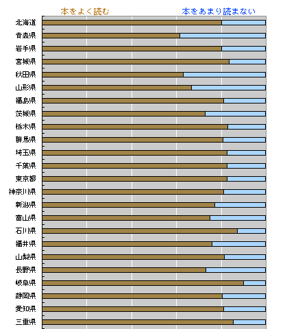 「よく本を読む」ほうの一位は、なんと、 「日向ボケ」で有名な宮崎県です。 「あまり本を読まない」第一位は青森県です。 文豪太宰治の出身地、青森県が あまり読まないというのは、 ぶっちゃけ、驚きです!! 太宰先生、「集計してすみません」。 結果の予想は、以下の通りでした。