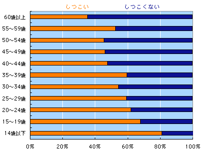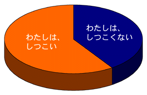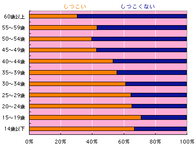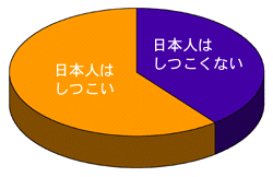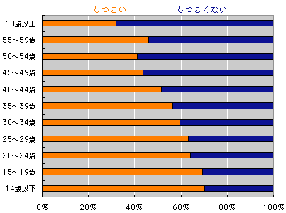 「しつこい」です! 「しつこい」が優勢です! 「しつこい」多数派です! 「しつこい」人が多いのです! だめもとなら「しつこい」がおすすめということです! 「しつこい」有利!「しつこい」勝訴! ああもうしつこいわ! 「日本人の思いのものさし」でいうと、 「日本人は、 けっこうしつこい」 ということになりました。 まあ、「しつこい」を良いほうへ言い換えれば、 「粘り強い」でしょうか? で、日本人は「粘り強い」って、 聞いたことありそうでしょう? もしかしてそれは、 「しつこい」だったのかも!? それぞれの集計を見てみましょう。