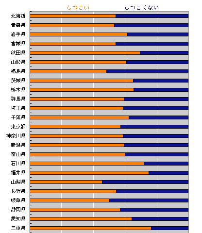 「しつこい」が 多かったベスト5は、 1位 三重県 2位 福井県 3位 香川県 4位 石川県 5位 和歌山県 です! おめでとうございます(?)。 県の公式HPに書いてもいいですよ! 「県民性‥‥しつこい」。 いかがですか? 逆に「しつこくない」が 多かったベスト5は 1位 山梨県 2位 鹿児島県 3位 福島県 4位 大分県 5位 岐阜県 やっぱり県の公報誌には 「県民性‥‥しつこくない」と 書いてほしいですね。 さて、結果の予想です。 最終結果とほとんど同じで、 「日本人は60%ほどしつこい」 ということになりました。