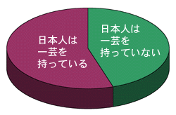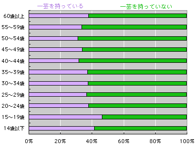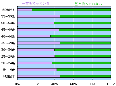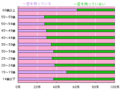 おやおや? 「芸は身を助く」と昔から言われているのに、 年齢が上がるにつれて「一芸を持つ」割合が 減っていくのはなぜなのでしょうか。 もしかしてこれも、ジャパニーズスタイル、 つまりは日本人の美しき習慣、それは「KENSON」、 いわゆる「謙遜」なのでしょうか?