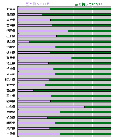 「一芸、ありません」と答える人が多い、 という結果になりました。 実は、そのわりには、 「こういう芸です」というメールを たくさんいただいているのです。 それについては、後ほど紹介しますね! さてその結果を「日本人の思いのものさし」でいうと、 「日本人は、かなり、 一芸を持っていない人が多い」 ということになりました。 「一芸入試」や「宴会芸」という 言葉がある日本ですが、 どちらかというと一芸のある人は 少数派なのですね。 さて、それぞれの集計を見てみましょう。