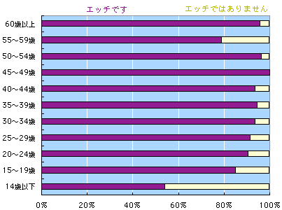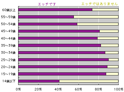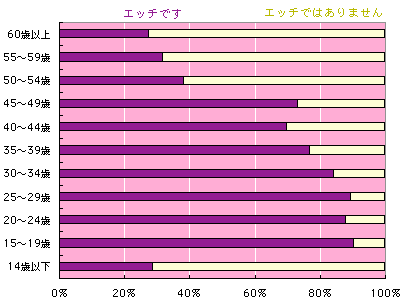 その結果を「日本人の思いのものさし」でいうと、 「日本人は、 それはもうエッチである」 という結果になりました。 年齢別、性別など、詳しい集計をご覧ください。