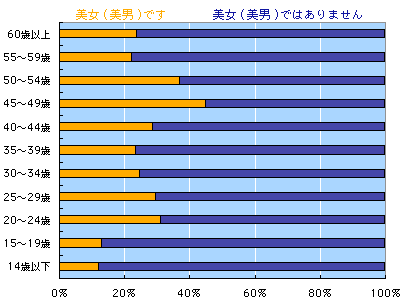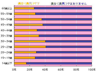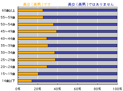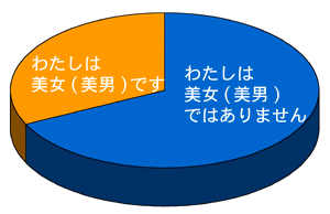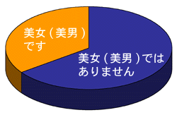 がーーーーん!!!!。 美女&美男、3割!! すみません、驚くところではなかったのでしょうか。 粛々と結果を受け止めてまいりましょう。 わたくしが意外に感じた理由は、 またのちほどメール紹介のところでお知らせいたします。 ああしかし、ここに、 先日の「花粉症アンケート」のような、 「どちらかといえば美女(美男)である」 といった項目がありしかば、 アンケートマジックやらで 結果は変わったのでしょうか? ともあれ、 この結果を「日本人の思いのものさし」でいうと、 「日本人は、 かなり美女(美男)では ありません」!! さて、それぞれの集計を見てみましょう。